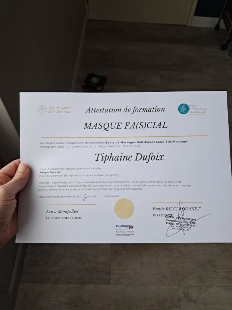 Des conseils techniques précieux transmis par un ostéopathe de renom Cette expérience enrichissante me permet aujourd’hui d’affiner mon analyse du visage avant chaque massage facial et de continuer à vous proposer des soins encore plus précis, adaptés et de qualité.